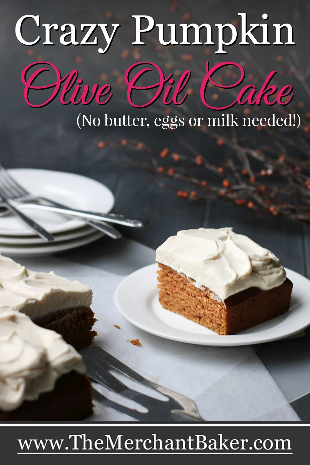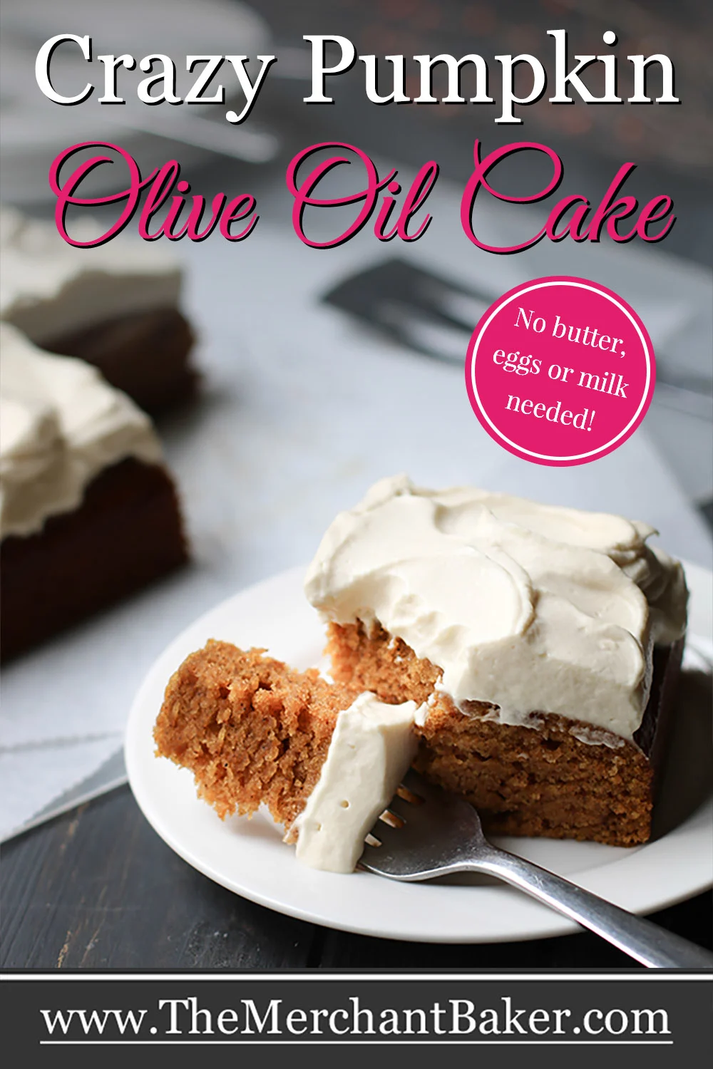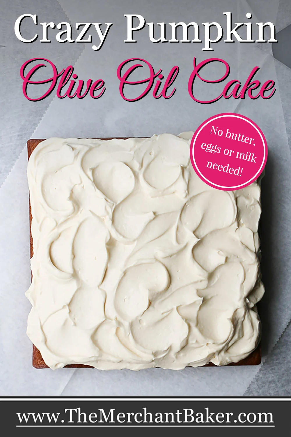 Crazy Pumpkin Olive Oil Cake is naturally dairy free. No eggs or butter necessary! It's a very moist, nicely spiced cake that's quick and easy to make. Top with Whipped Maple Cream Cheese Frosting for a delicious fall dessert!